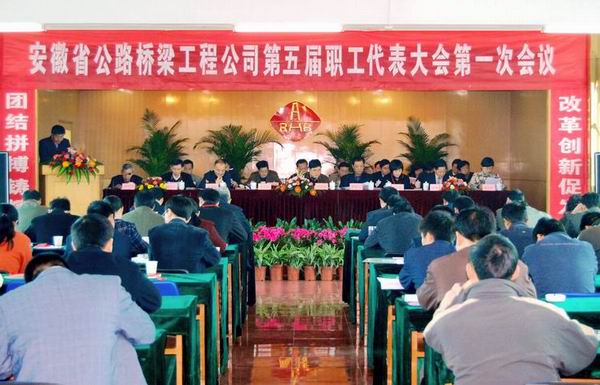 8:45,在庄严的国歌声中,第五届职工代表大会第一次会议正式开幕。公司总经理汪卫东向大会作了题为《统一思想 坚定信心 为实现安徽路桥的新崛起而奋斗》的工作报告。汪总在报告中指出,这次会议,是在当前国家扩大内需、加大基础设施建设的特殊环境下,是在集团公司对当前经济形势科学研判和正确部署下,是在路桥公司谋求新崛起的关键时刻召开的一次十分重要的会议。