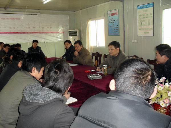 311上午,汪总在项目部会议室召开会议,会议由项目经理杜海峰主持。会上杜经理对项目施工目前还存在的一些问题进行了自查自纠。接着是汪总发表了重要讲话。汪总首先让大家介绍自己,还特别关心了年轻的技术员们,仔细记下每个人的名字。随后汪总充分肯定了项目部去年各方面的工作情况,并且指出泗许项目是公司在2009年承接的第一个项目,公司各界领导非常重视。同时也充分肯定了项目经理杜海峰的工作。接着,汪总对我们项目的工程建设提出了几点要求: