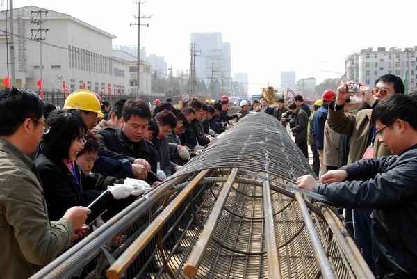 项目办负责人向学员们简单介绍了工程概况。学员们在工人师傅的指导下,纷纷戴上手套、拿起工具,给已成型的桩基钢筋笼绑扎钢丝,亲身体验了建设者的辛劳。学员们虚心向工人师傅学习,紧围着钢筋笼,一边认真扎丝,一边相互交流,探讨绑扎技巧。在学员们的巧手下,两个钢筋笼很快完成绑扎,将用于晚间施工。