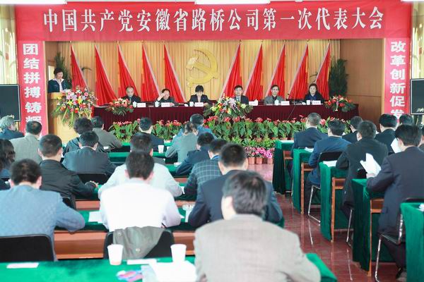 公司七楼大礼堂,气氛隆重热烈。主席台上方悬挂着“中共安徽省路桥公司第一次代表大会”的会标,后幕正中是镰刀和锤头组成的党徽,10面鲜艳的红旗分列两侧。上午8点15分,大会在庄严的《国歌》声中正式开始,上午的大会由公司总经理、党委副书记汪卫东同志主持。