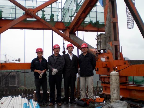 31日上午,在经过整夜大雨后,天空依旧飘散着凉凉的细雨。盛总一行在项目总工胡学祥和项目副经理张林的陪同下,对岩子脚大桥进行了认真的检查,并冒雨登上高达74米的4号主墩施工现场。他就进行到挂蓝施工阶段的大桥与项目人员展开讨论,对施工现场存在的施工难点和注意事项一一指出。盛总对项目部克服种种困难加紧施工作出了肯定。