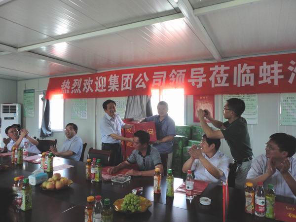 我部项目经理王炜生就项目的施工总体进度及近期工作开展、完成情况,向李总一行领导作了简要的汇报。李总在认真听取了汇报后,指出省高速控股集团公司会大力支持建设单位的工作,建设单位要重质量、保安全、抓进度;希望建设单位要积极克服各种施工困难,早日实现蚌淮高速公路通车的目标。