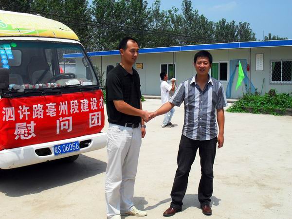 安徽交投集团泗许高速亳州段建设办到泗许01标慰问 发布时间:2009年07月29日 来源:泗许01标 发布人: 作者:章玉洁 浏览:5215次 连日来,持续高温,7月24日上午,交投集团泗许高速亳州段建设办综合部部长王文飞一行带着绿豆等防暑慰问品,冒着烈日来到泗许项目01标进行慰问,让我标段的所有员工在高温一线倍感清凉。