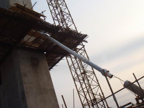 该斜拉索长19.0米,重1吨,由43根钢绞线组成。据悉,六安淠望路大桥主塔共有斜拉索60根,由高强度、低松驰的光面钢绞线组成。单根钢绞线直径为15.2mm,标准强度fpk=11860Mpa。斜拉索采用三层防护:第一层涂油脂或石蜡,第二层为单根钢绞线热挤单层PE层,第三层整体索外包HDPE双层护套。主塔的左、右幅索塔各布置了15对斜拉索,最大索长123.0米,重12吨,由73根钢绞线组成。 整个斜拉索施工计划到2010年4月份完成。