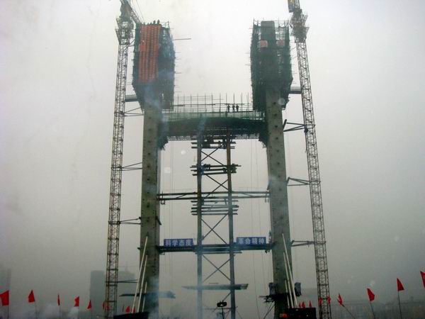 作为整座大桥的控制性工程,主索塔施工一直是各方关注的焦点,并成为影响我项目总体施工进度的主要因素。为此,项目部领导班子经过多次研究分析并大胆决策,决定改变以前多点开花,齐头并进的工作方向,将工作重心向主索塔偏移,从人员到设备优先满足主索塔的施工需要。针对施工过程中遇到的技术难题,项目部及时邀请有关专家及公司领导到施工现场指导,制定解决方案。在积极赶超进度的同时,项目部将安全和质量摆放在首要位置。在施工过程中,项目部不仅建立了完善的安全、质量保障体系,更积极增加投入,全方位确保主索塔施工质量,并使主索塔施工速度得到稳步提升。