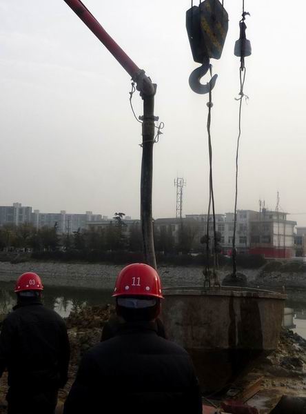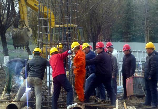 下午2时左右,钢筋笼开始安装。项目经理李建成和工人一道细心的将钢筋笼送至桩孔中。导管安装完毕后,混凝土浇灌开始。到下午4时20分左右,宋斗湾路工程第一根桩浇注完毕,桩基成型。