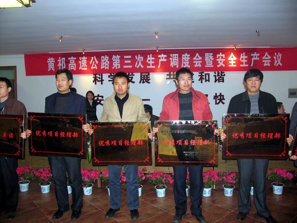 201031,在黄祁高速公路第三次生产调度会暨2009年总结表彰大会上,安徽省公路桥梁工程公司黄祁高速公路08标项目经理部获得安徽省高等级公路工程建设指挥部授予的“2009年度优秀项目经理部”荣誉称号,同时质量安全部负责人何增华被授予“2009年度优秀安全工程师”荣誉称号。