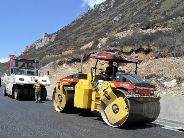 52下午,四川松潘县晴空万里,漳黄公路02标沥青拌合站现场机器轰鸣,漳黄02标在整个标段率先开始摊铺沥青试验段。