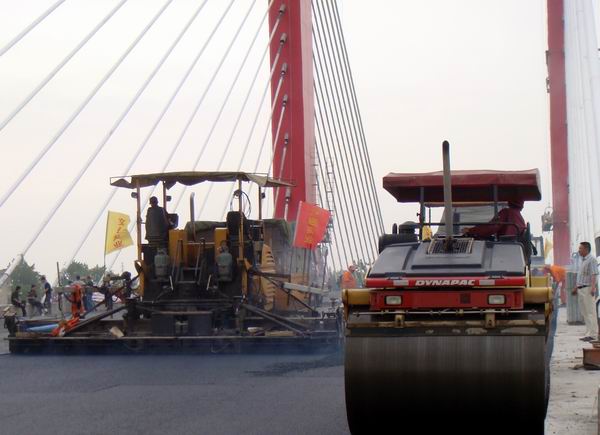 为了提高大桥桥面沥青铺装质量,在摊铺前项目部组织200余名工人突击清理桥面表面浮浆,待冲刷干净并涂上防水层后,开始摊铺沥青。在摊铺过程中全部使用自动摊铺机和重型压路机,使摊铺、碾压等工序科学合理、规范达标。摊铺施工刚一结束,黑亮宽敞而又整洁顺畅的桥面就引来周边过往市民的啧啧称赞。