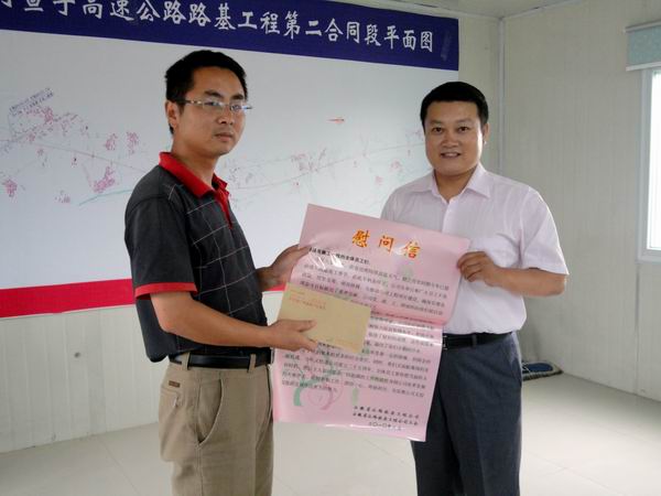 712下午,路桥总公司工会副主席胡运春、路面公司党支部副书记李杨、工会副主席姚光群一行不辞辛苦,冒着大雨,来到宣宁高速公路路基工程02标项目部,对奋战在建设第一线的宣宁02标五十多名干部职工表示了亲切的慰问。项目副经理王强、总工王守武带领全体项目职工热情接待了胡主席一行人员。