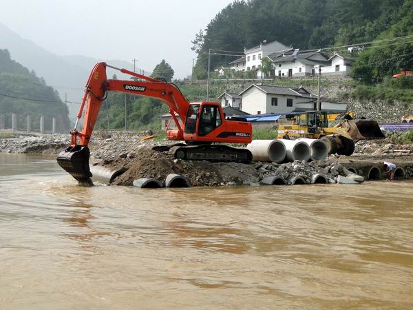 27日开始,天气放晴,水位下降,我部抓住机会进行第三次抢修,一台挖机、一台装载机和五台运输车同时作业,终于在28日上午打通便桥。项目部迅速组织人员把施工设备、施工材料调运到对面,28日下午恢复小型结构物施工。