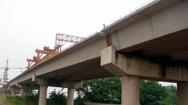 江南的7月是个多雨的季节,自进入7月以来,青弋江项目遇上连日暴雨,长江水位猛涨,青弋江水位也随长江水位增高和上游陈村水库泄洪而增高,一度超过了98年同期水位,致使对岸红星圩大堤被县防指封堵,东岸施工平台被淹,被迫停工半月之余。再加上受洪水、停电、停水等不利因素的影响,项目生产出现困难,但项目部及时调整施工方案和对策,不等不靠,采取灵活方案,积极进行施工生产:主桥不能干就干引桥,白天不能干就晚上干,停电就自己发电,没有水就挑水或买水……努力克服重重困难,保工期、保质量。到月底即731日止,共完成3230M箱梁的安装,主桥已完成5#墩的7#块、6#墩的5#块的浇筑任务,预计8月底能完成主桥全跨的合拢任务。9月份全桥将进入上部桥面系的施工,全桥预计在10月底全部完工。