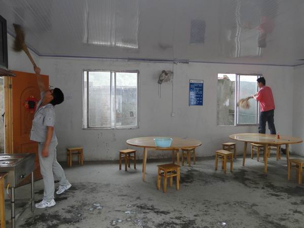 下午5点,按照先前的分工,各部门的团员都积极行动起来。试验室负责餐厅生活区,工程部、质检部负责宿舍楼,其余部门负责办公走廊及前场活动区域的卫生打扫。清洗桌子,擦洗门窗、打扫走廊,清理枯枝败叶,经过两小时的辛勤劳动,整个项目部焕然一新。