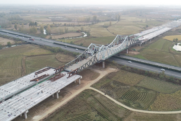 跨宁洛高速桥采用桁架体系钢桁梁顶推施工, 杆件类型多,之间采用高强螺栓连接,操作难度大,风险系数高,安全控制要求严。项目在顶推施工前从方案论证、安全技术交底、顶推滑道设计、钢桁架拼装焊接等环节严格把关,经历3次拼装、3次纵向顶推、1次横向顶推,最终将70000套高强螺栓连接的2500吨梁体顶推就位。