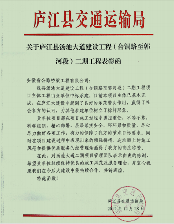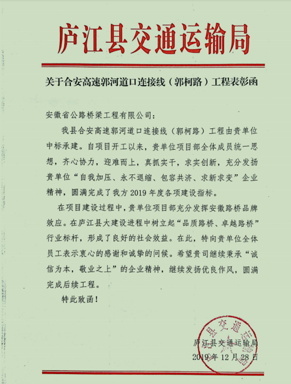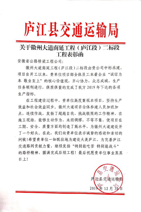 近日,公司收到庐江县交通运输局寄来的表扬信,对徽州大道南延工程(庐江段)二标段、汤池大道建设工程(合铜路至郭河段)二期及合安高速郭河道口连接线(郭柯路)工程等三个项目积极克服各类困难,高标准、严要求推进施工生产给予表扬和感谢。