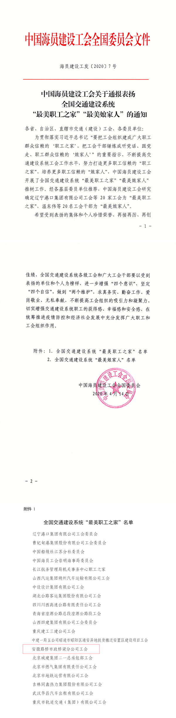 近日,中国海员建设工会全国委员会下发通知,通报了全国交通建设系统“最美职工之家”评选结果,市政分公司工会成为安徽省唯一一家获此殊荣的基层工会。