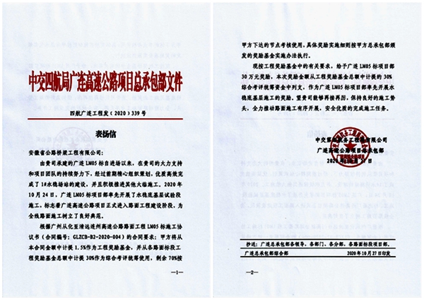 近日,中交四航局广连高速公路项目总承包部发来表扬信,对公司承建的广连高速05标优质高效完成1#水稳场站建设和率先启动水稳底基层试验段施工给予表彰。