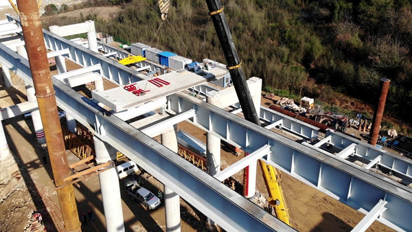 下叶村特大桥全长1440米,上部结构采用40米钢板组合梁。首片架设的桥面板重约36.6吨,采用短线匹配法工艺预制,该工艺为我省首次应用于桥面板预制,具有预制精度高、安装速度快等特点。桥面板首件顺利安装,标志着该大桥进入钢板组合梁、板同步架设施工阶段。