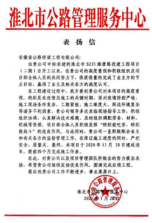 1月28日,淮北市公路管理服务中心向公司发来表扬信,对淮北S235项目团队保质保量提前完成施工任务给予表扬。