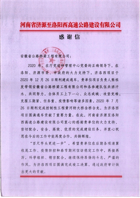 感谢信指出,黄河特大桥项目克服工期紧、任务重、疫情影响等诸多不利因素,于2020年7月26日顺利完成控制性工程黄河特大桥全桥合龙施工任务,为济洛西高速圆满通车贡献了力量。希望项目在接下来的工作中继续保持昂扬的斗志,严谨的作风,为济洛西高速圆满完成竣工决算,通过审计验收做出更大的贡献。