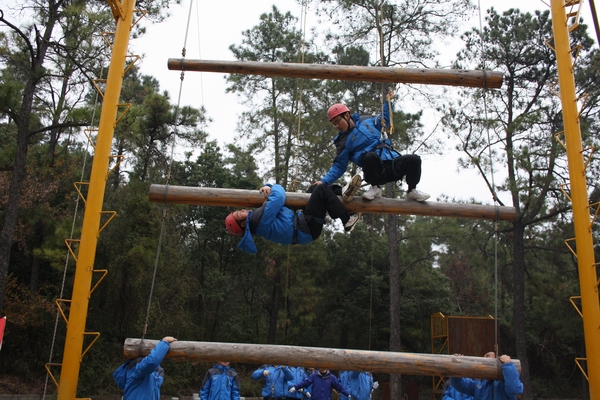 在培训基地,学员被随机分为三组,通过民主讨论选出各自的队长、队名、队歌和口号。在随后的拓展培训中,三组队员依靠团结协作、顽强拼搏、毫不畏惧的精神顺利完成了“背摔、断桥、天梯、空中单杠、求生墙”等挑战性项目,通过这些项目的挑战,经过带训老师针对性的启发和指导,使广大学员加深了对团队协作、互助互信的理解,达到了挑战自我、熔炼团队、提升沟通与合作的目的。