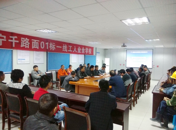 11月4日晚,宁千路面01标会议室座无虚席,40余名农民工兄弟再一次享受着该项目农民工业余学校带来的知识和乐趣。